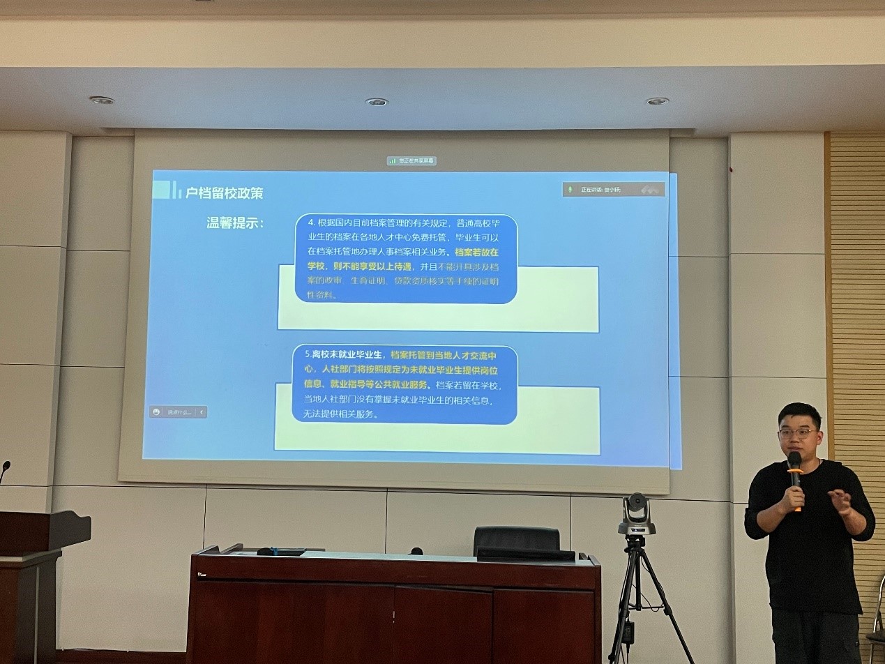 针对毕业离校工作以及户档转递相关工作,研究生部分由辅导员陈海波进行了详细讲解,本科生部分由辅导员王哿进行了具体说明。两位老师详细介绍了毕业去向登记制度,为同学们解读最新的户档留校相关政策,指导毕业生提交毕业去向流程,强调了就业信息校核的必要性以及重要性,并对学校整体离校工作安排进行讲解,对重要时间节点如毕业生体检、毕业典礼、办理离校手续等为同学们进行了说明。两位老师还在最后祝福学子们毕业快乐,在未来变得更好。