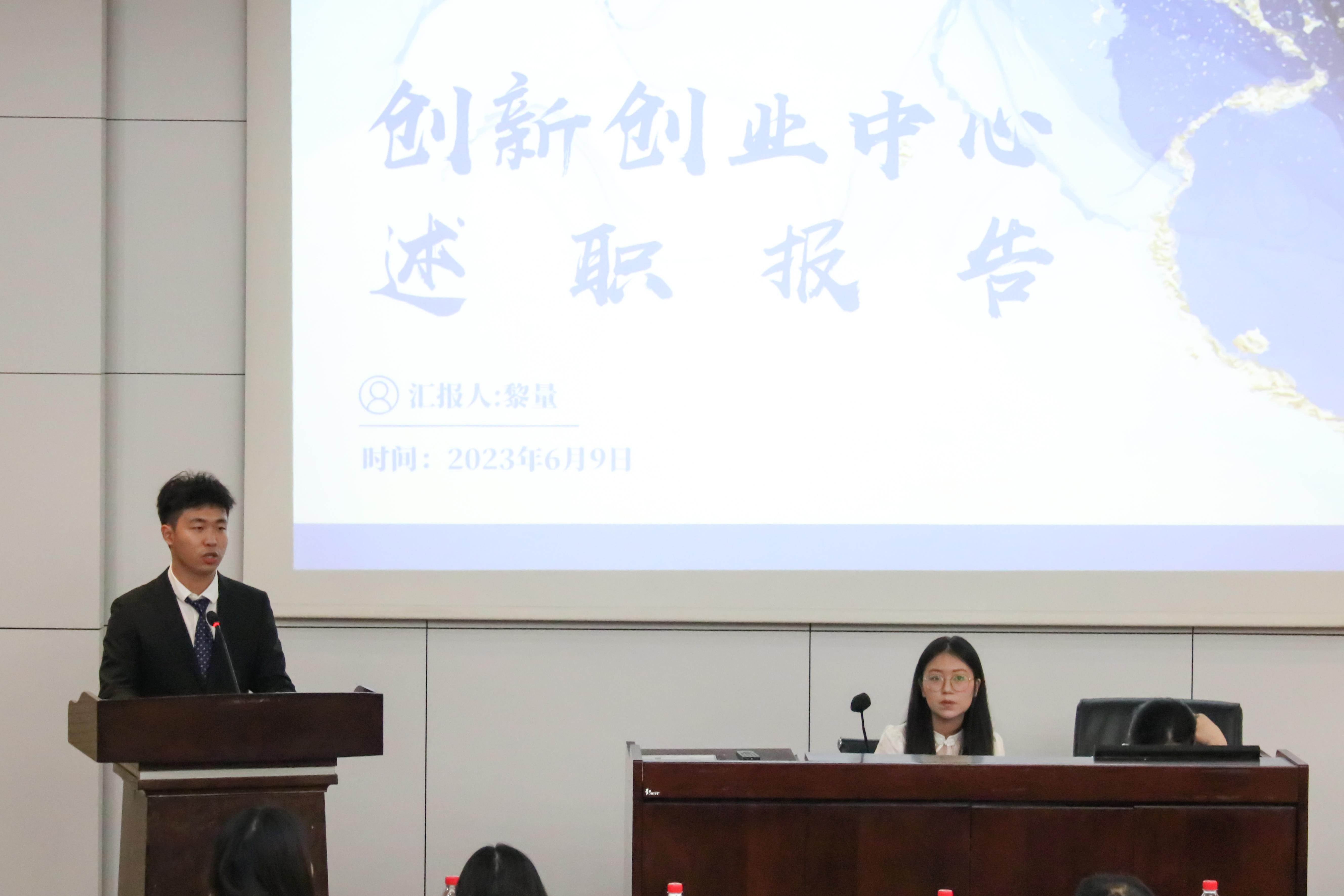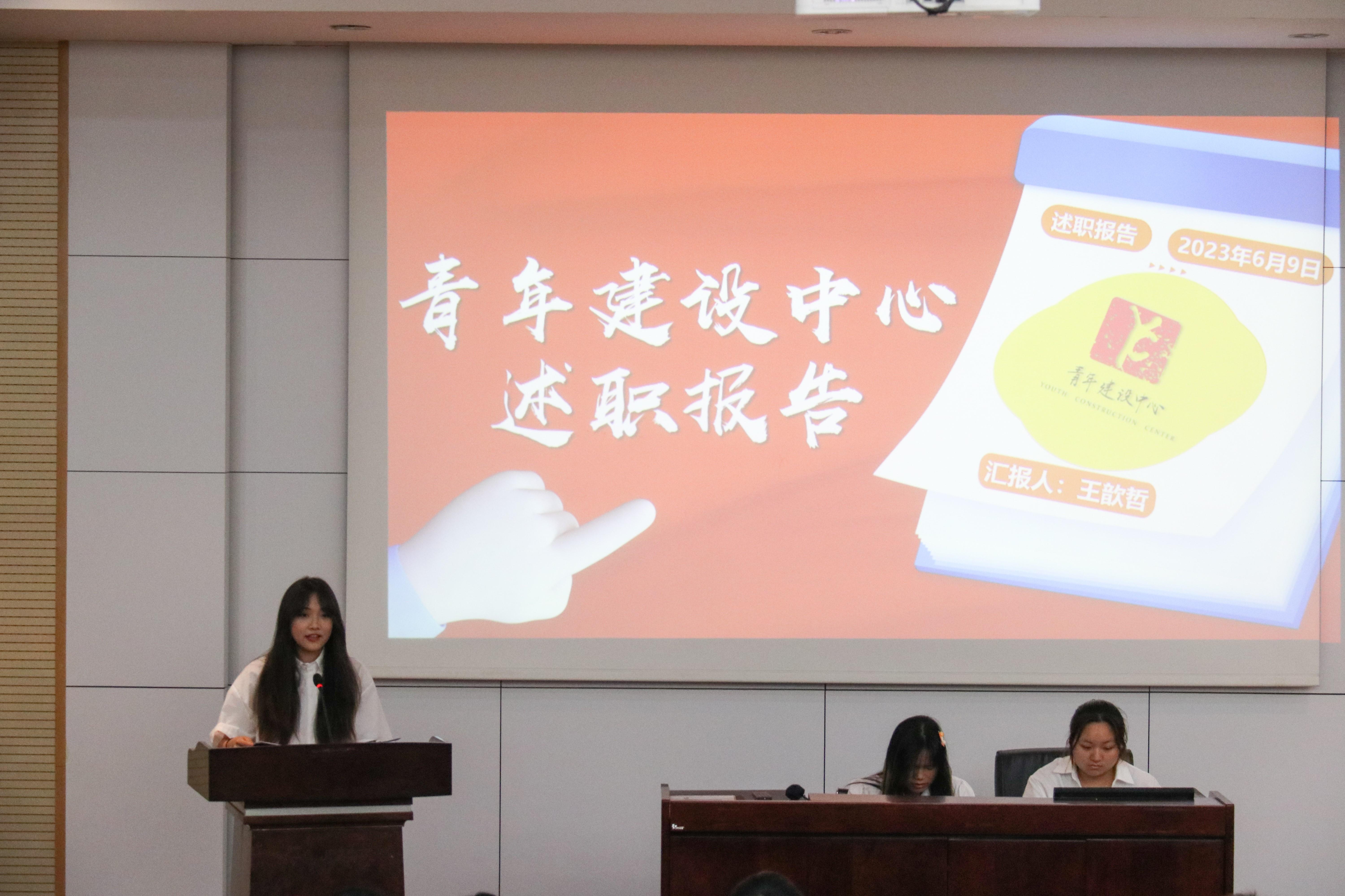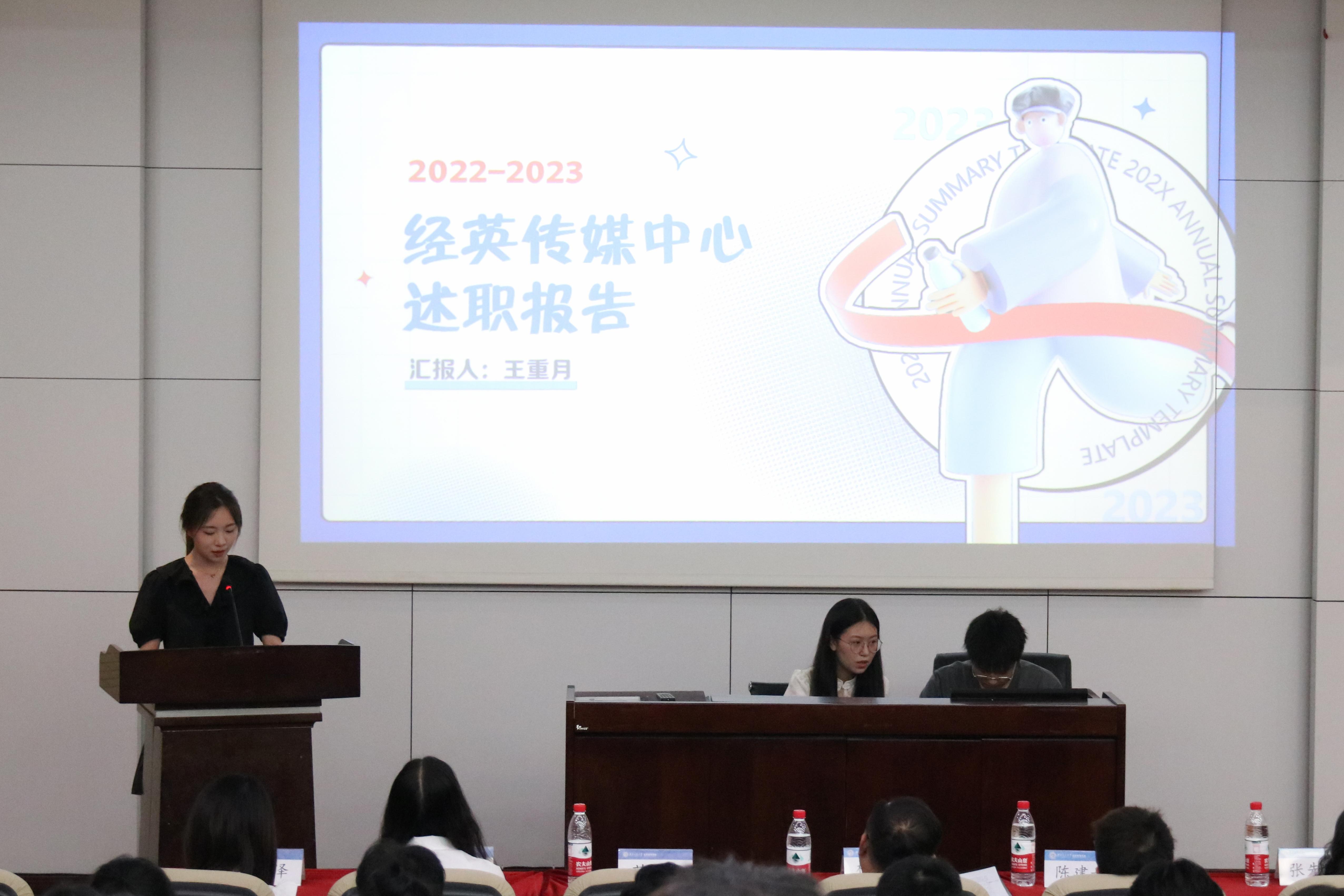 的六个团学组织青年建设中心、学生会、青年志愿者协会、创新创业中心、经英传媒中心、班级联合会的负责人依次述职。他们不仅回顾总结了一学年的工作,也对全体团学组织成员的辛勤付出和积极工作表示由衷的感谢。