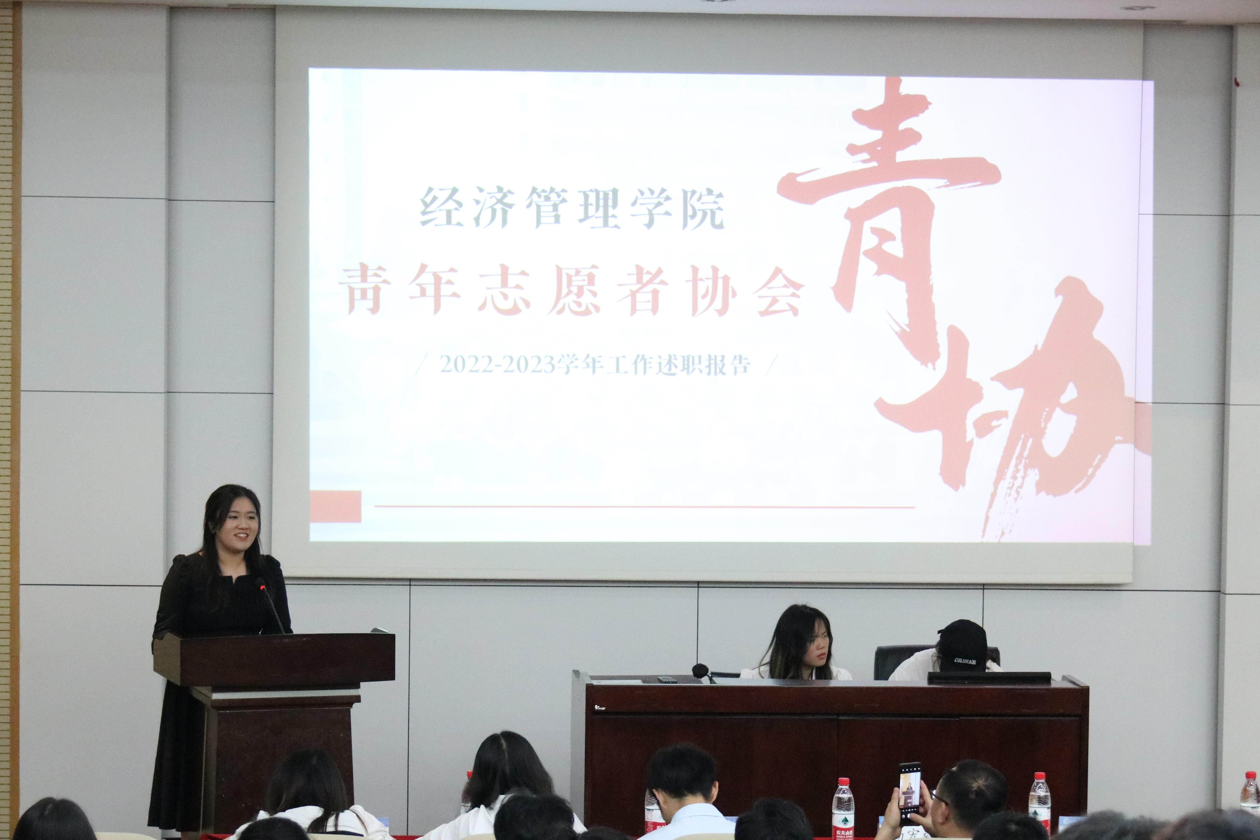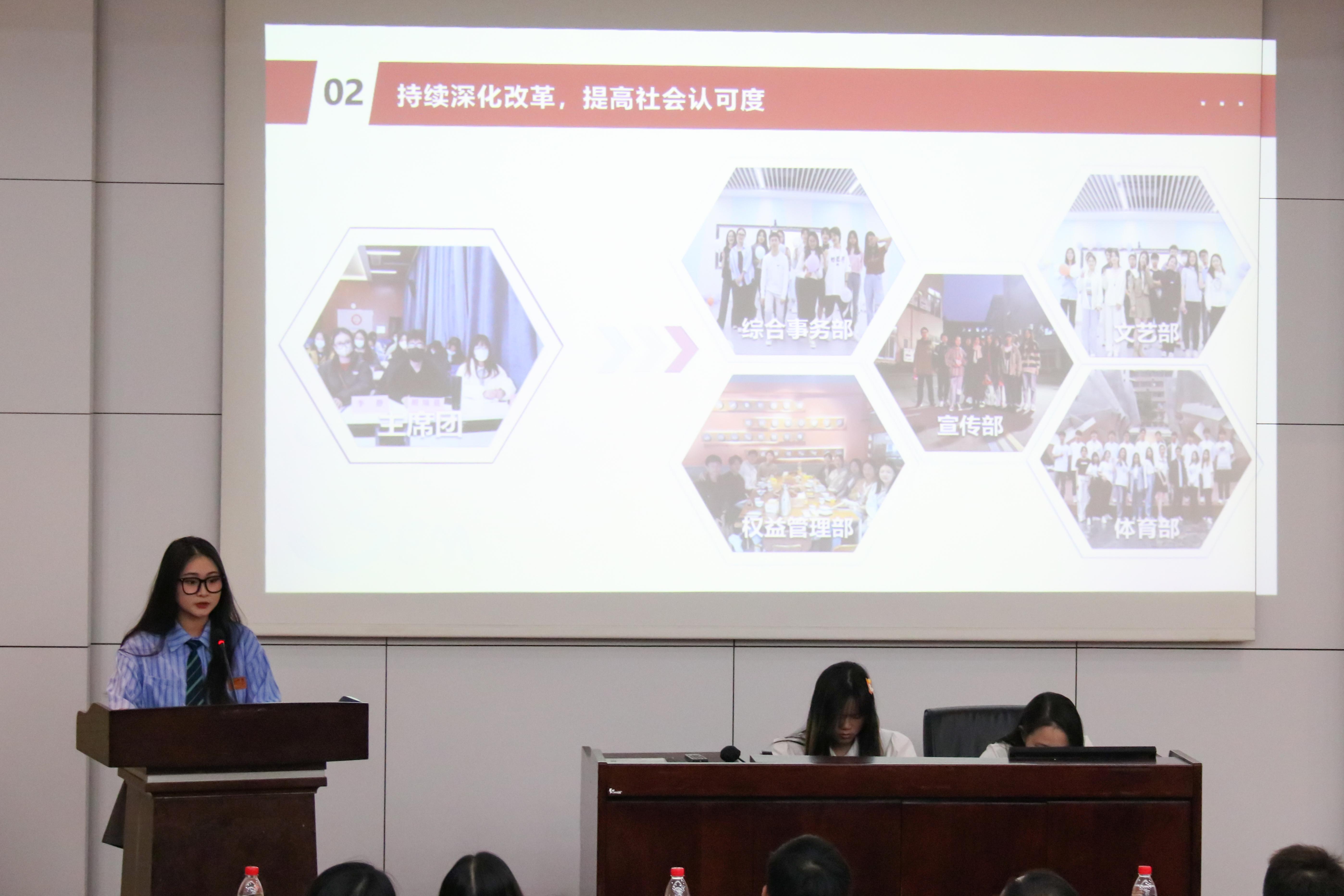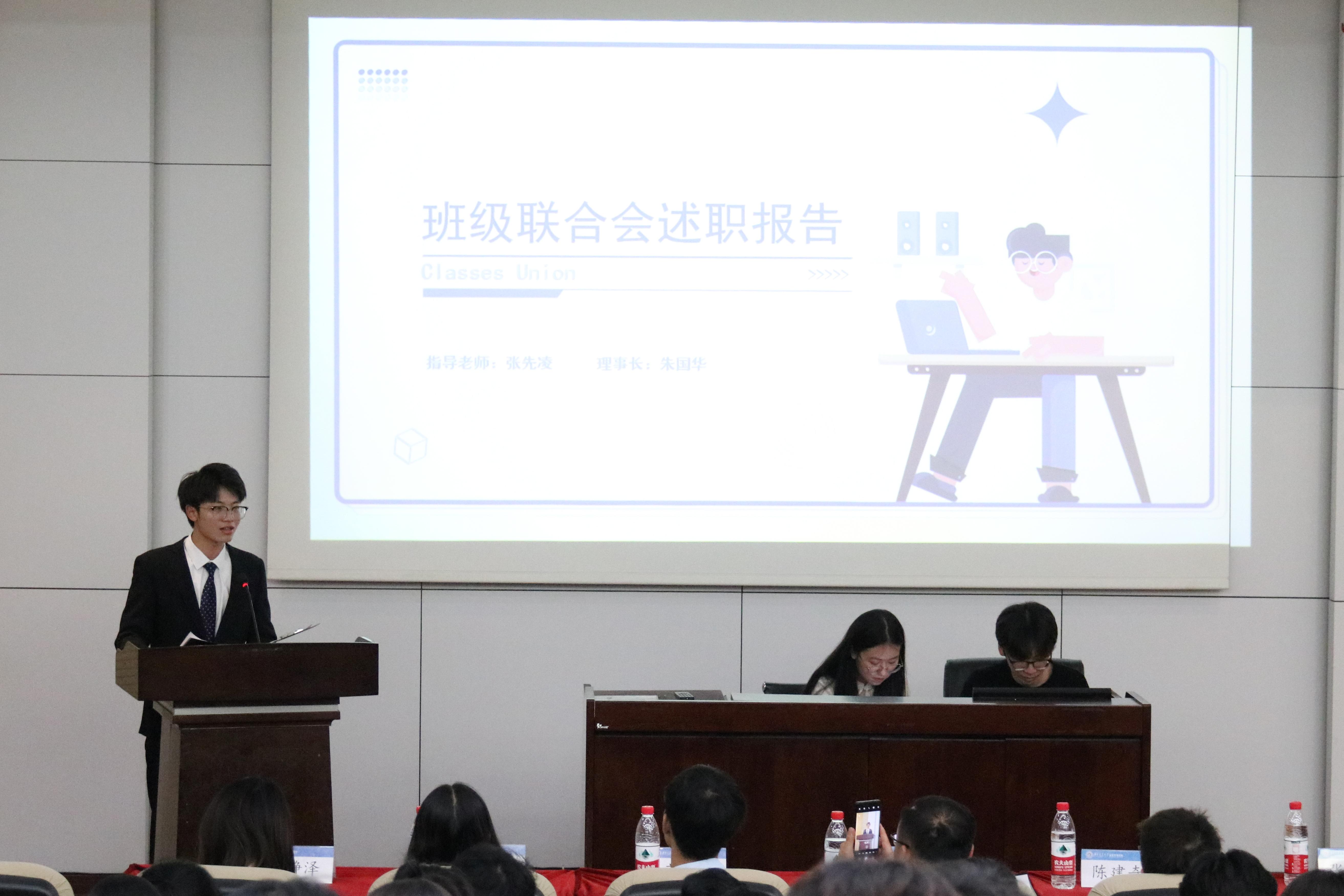 的六个团学组织青年建设中心、学生会、青年志愿者协会、创新创业中心、经英传媒中心、班级联合会的负责人依次述职。他们不仅回顾总结了一学年的工作,也对全体团学组织成员的辛勤付出和积极工作表示由衷的感谢。