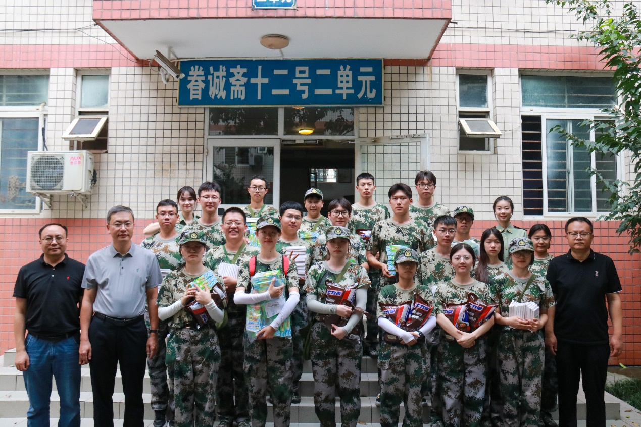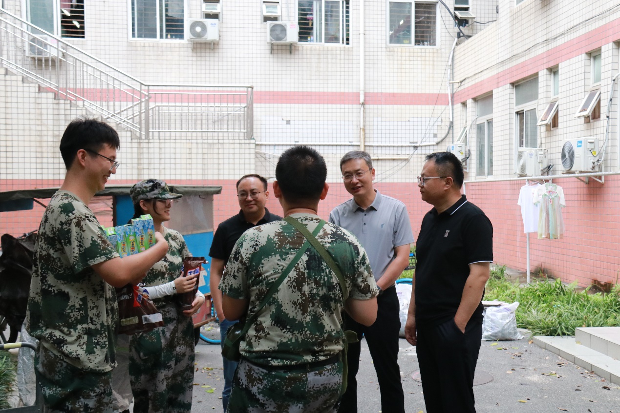 党委书记王斌、执行院长郭强、党委副书记杨宏毅及2021级辅导员张先凌、钟文婷在九里校区眷诚斋12栋2单元慰问暑期2021级军训学生。