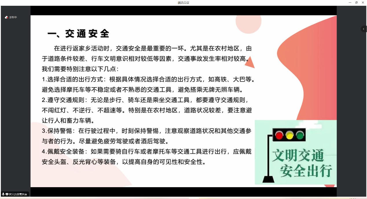 动员环节结束后,青年志愿者协会的干事细致地为各支队伍讲解“返家乡”相关事宜,围绕活动介绍、安全须知、实践要求、报账流程、投稿环节、经验分享、风采展示这几个方面展开。主讲人强调各队伍成员要严格遵循制度纪律,按时进行安全报备,保证出行安全。同时,提醒各支队伍在寒假实践期间随时关注气象变化,预防冬季常见疾病;具备完善的安全常识,做好充足的出行准备,增强救护能力。并为大家了列举了常见的极端天气与灾害自救方法以及预防冬季疾病的注意事项。特别提醒大家,各项实践活动应在保障队员安全的情况下进行,如遇突发情况应及时取消行程并向学校、易游体育