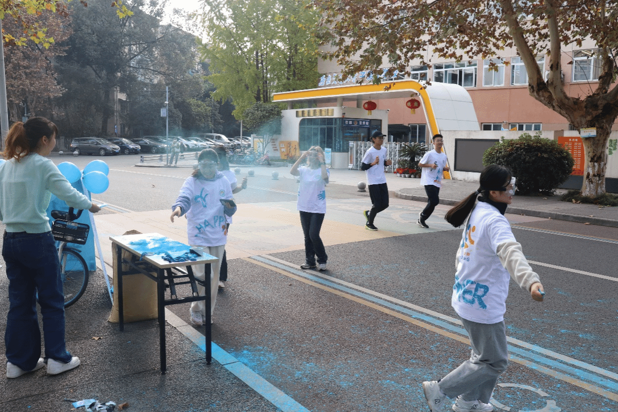 同学们从零号教学楼出发,一路途经学生一食堂、篮球场、大学生会堂,最终回到零号教学楼。途中设有三个补给站,同学们路过补给站时可领取彩色粉末,并相互肆意泼洒,欢声笑语中,彩色粉末似精灵般在空中飞舞盘旋,瞬间汇聚成一幅绚丽多彩的油画。同学们身上的白T恤也被染得五彩斑斓,那一刻,时间仿佛凝固,所有的烦恼都被抛诸脑后,青春的活力与激情展露无遗。