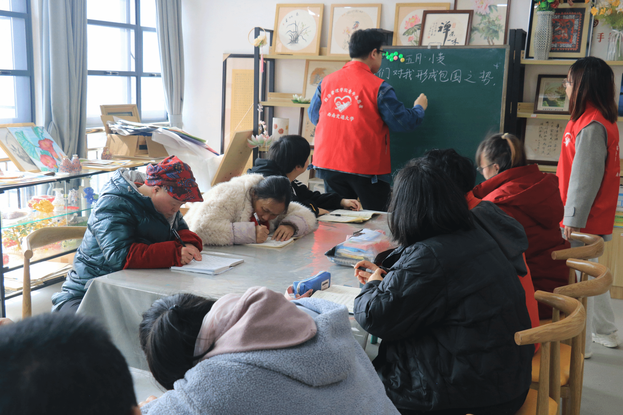 青年志愿者协会分别走进善工家园与阳光家园,为残障群体送去温暖与关怀。3月6日下午,青协组织志愿者前往善工家园,举办了“助残之旅,花与暖的交织之旅”主题手工花制作活动。活动中,志愿者与残障人士结成“一对一”帮扶小组,耐心细致地示范皱纹纸折叠、丝网花瓣缠绕等手工技巧。面对听障学员,志愿者们通过形象的手势和纸笔书写进行沟通交流;对于肢体障碍者,志愿者则贴心协助完成剪裁、粘贴等操作。经过两个小时的共同努力,一朵朵娇艳的郁金香、玫瑰、百合等手工花绚丽绽放。此次活动,不仅让残障人士深切感受到了社会的关爱与尊重,也让志愿者们收获了“被需要”的幸福感,进一步增强了社会责任感。