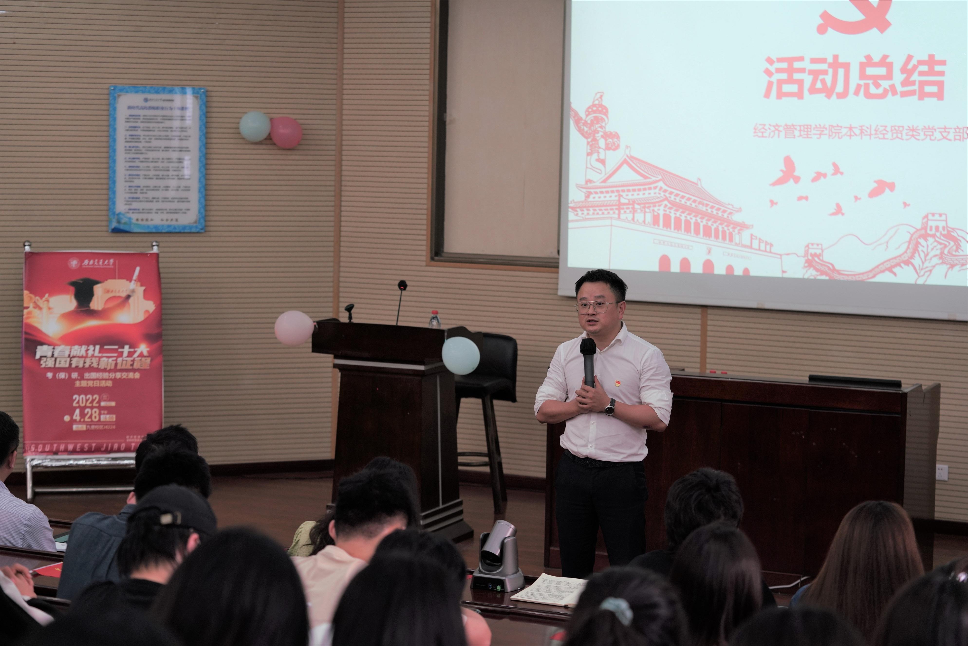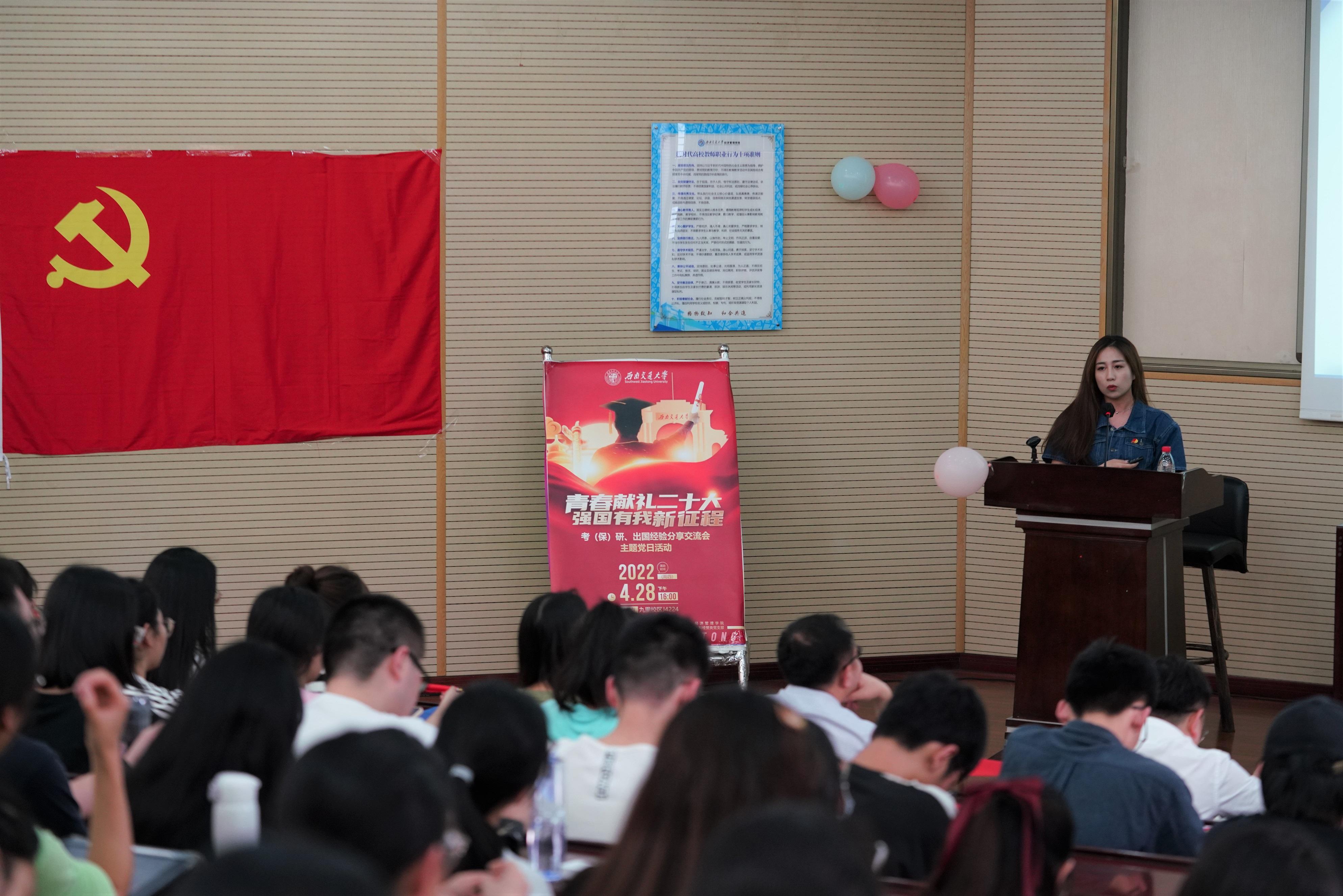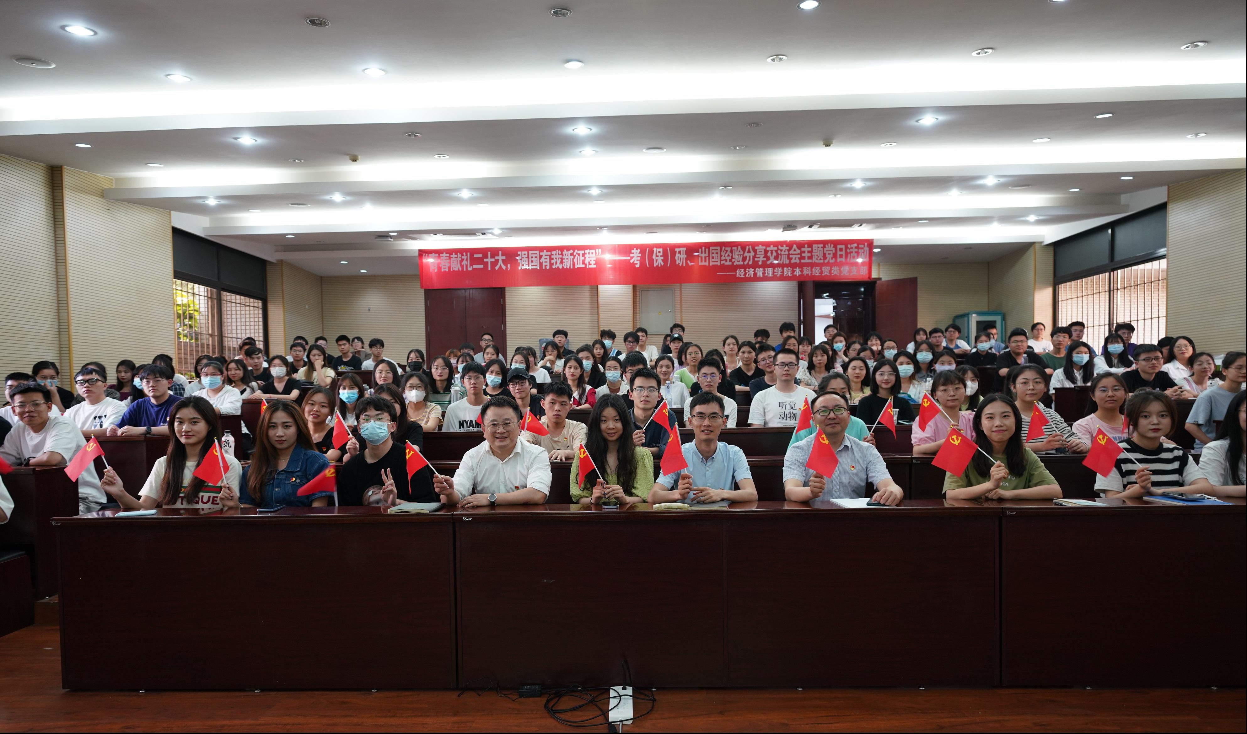 本科经贸类党支部于2022年4月28日在J0202举办了“青春献礼二十大,强国有我新征程”主题党日活动,邀请本科2018级部分同学对考研、保研、出国等方面进行经验分享交流,党支部全体党员、积极分子参与此次活动。