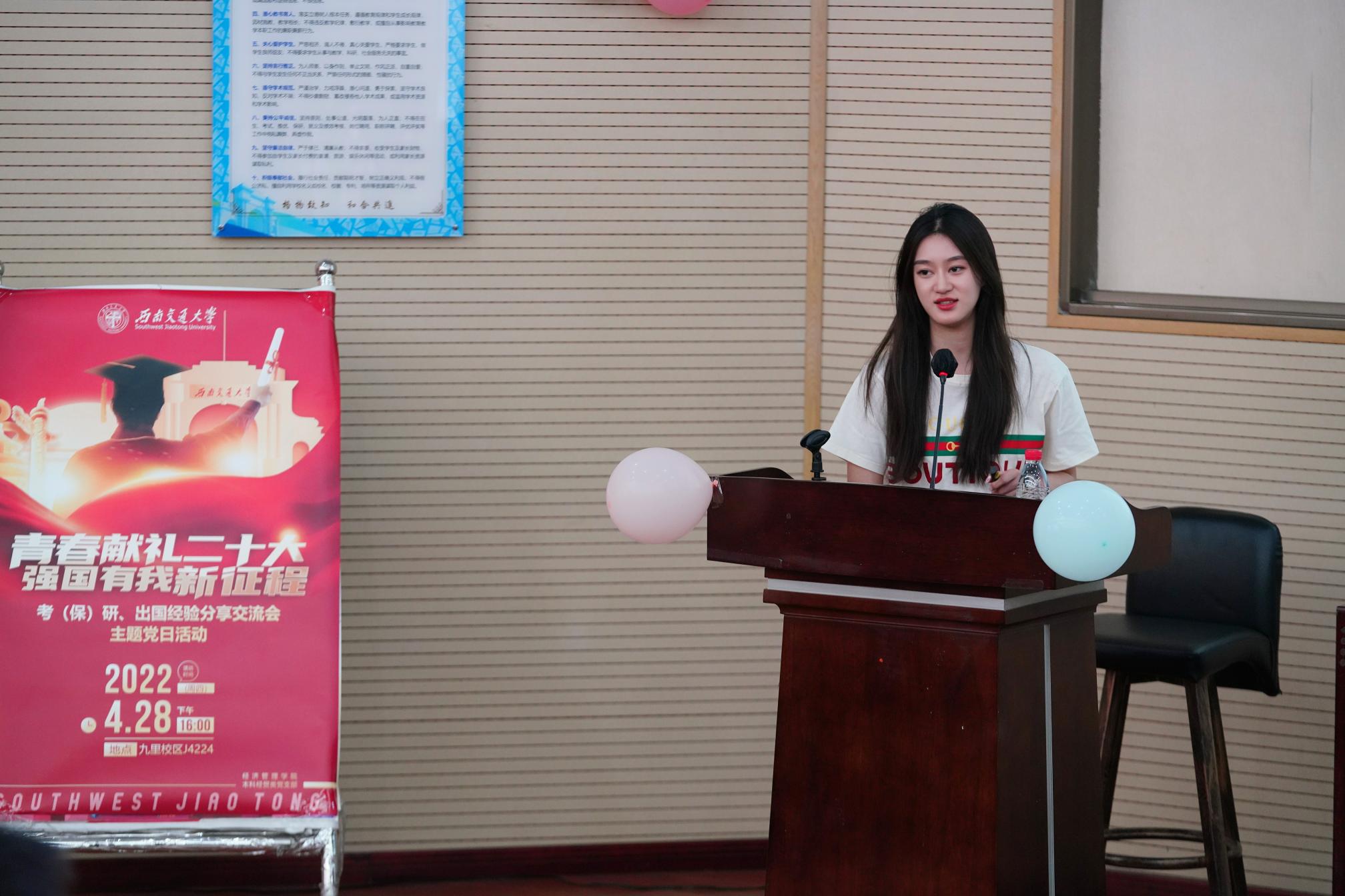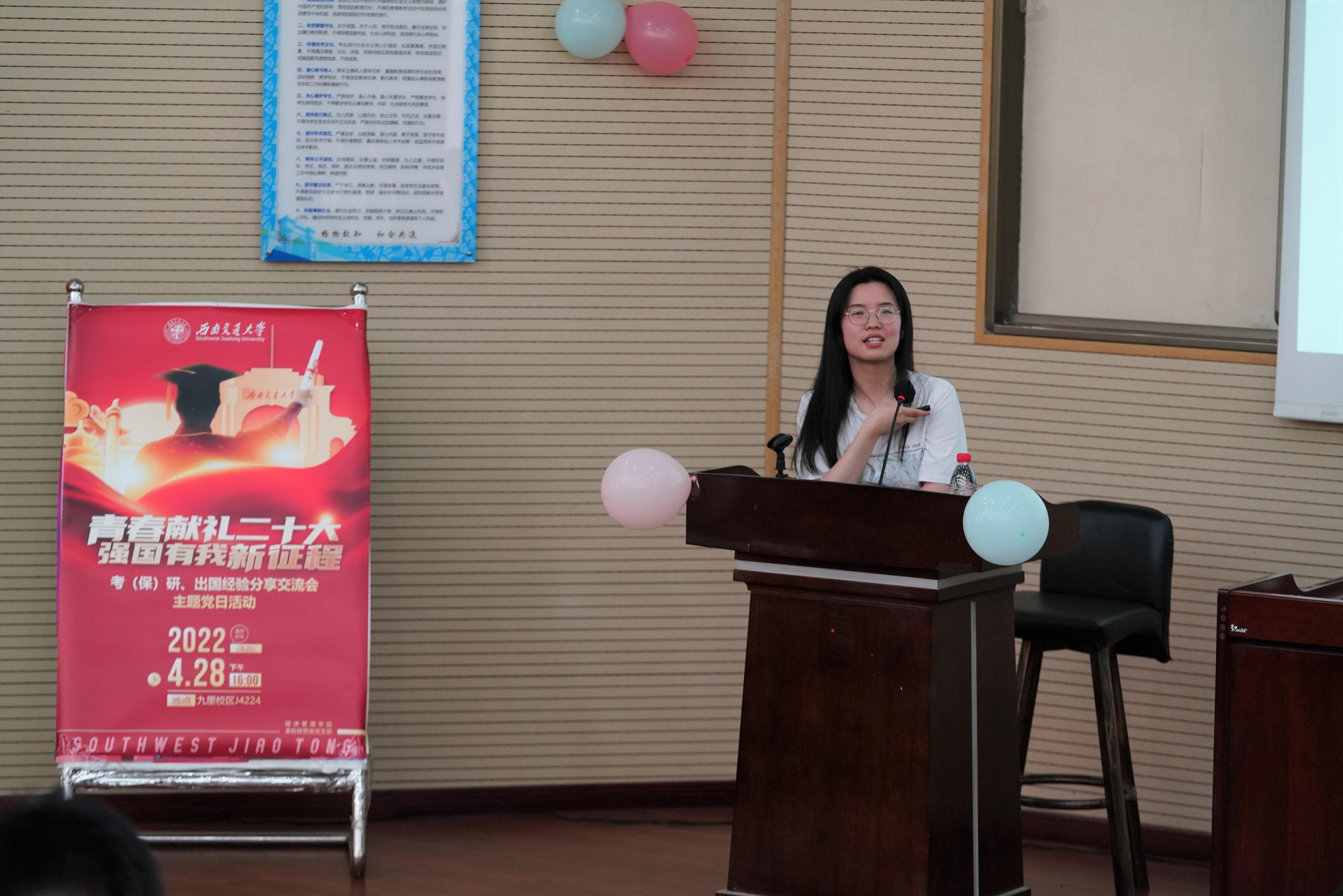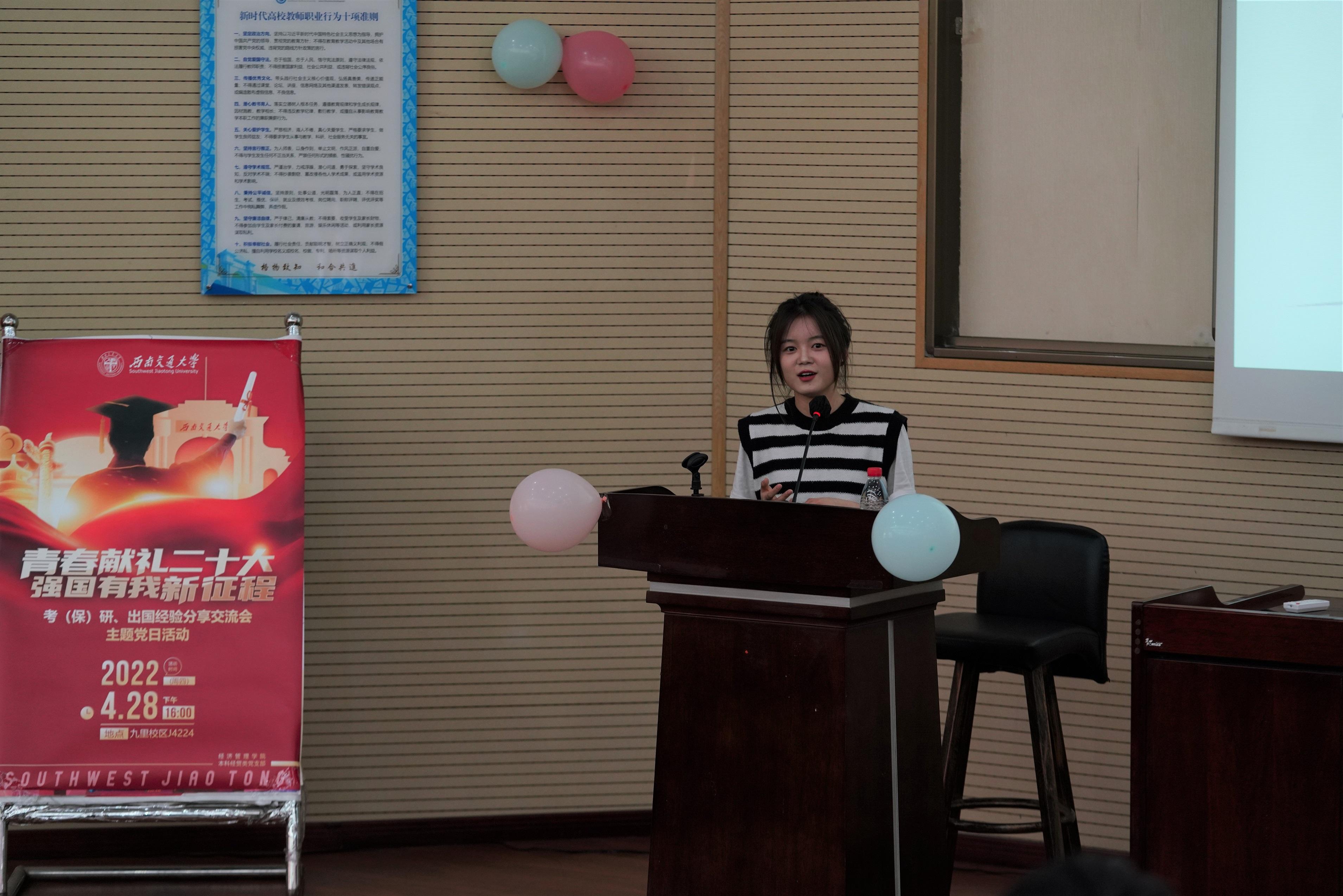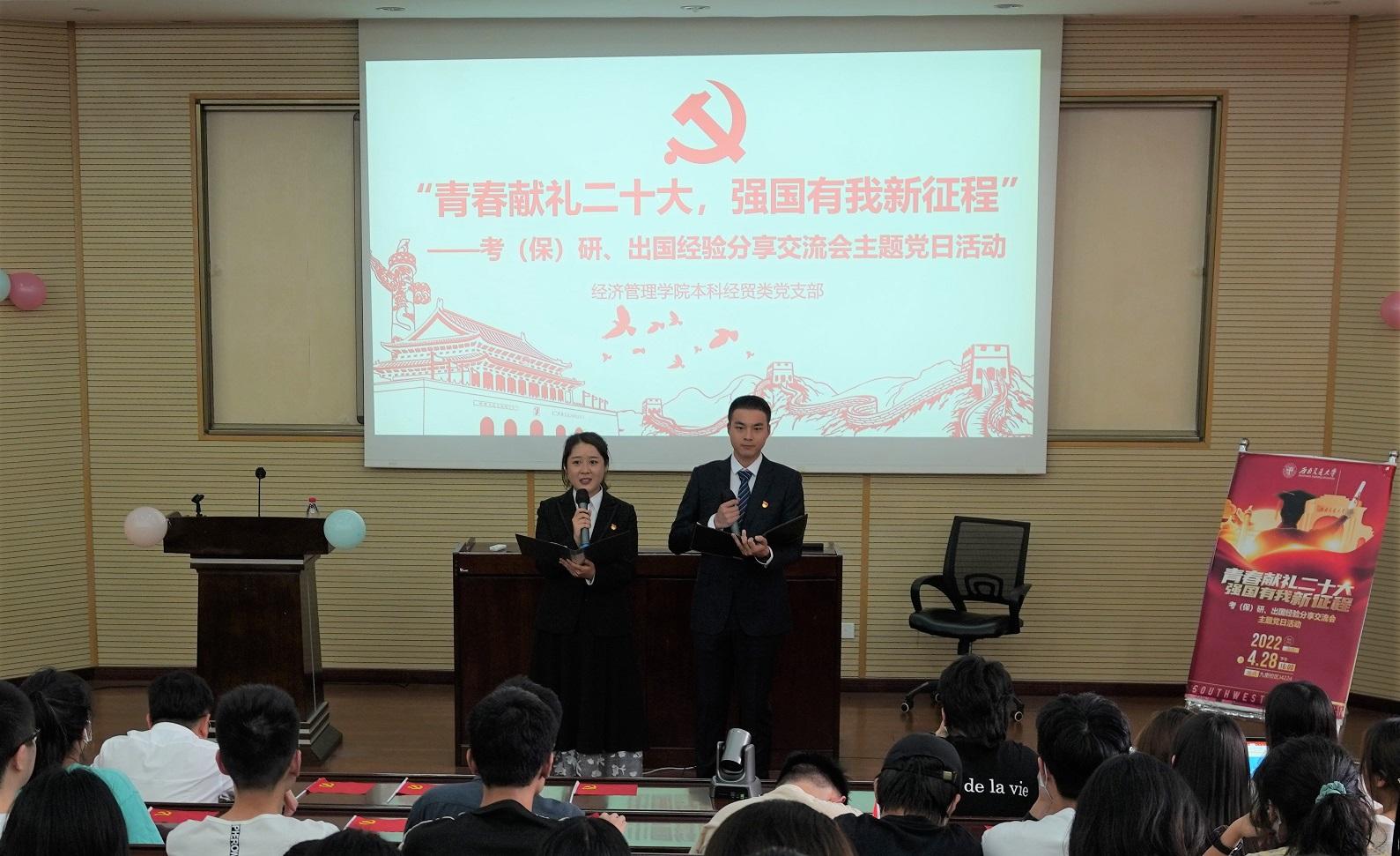 本科经贸类党支部于2022年4月28日在J0202举办了“青春献礼二十大,强国有我新征程”主题党日活动,邀请本科2018级部分同学对考研、保研、出国等方面进行经验分享交流,党支部全体党员、积极分子参与此次活动。