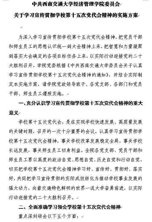 委员会关于学习宣传贯彻学校第十五次党代会精神的实施方案》。方案根据学校党委关于认真学习宣传贯彻学校第十五次党代会精神的通知要求,结合实际,明确了全面准确学习领会学校第十五次党代会精神的主要内容、具体安排和落实要求。方案指出,要充分认识学习宣传贯彻学校第十五次党代会精神的重大意义,抓好易游体育