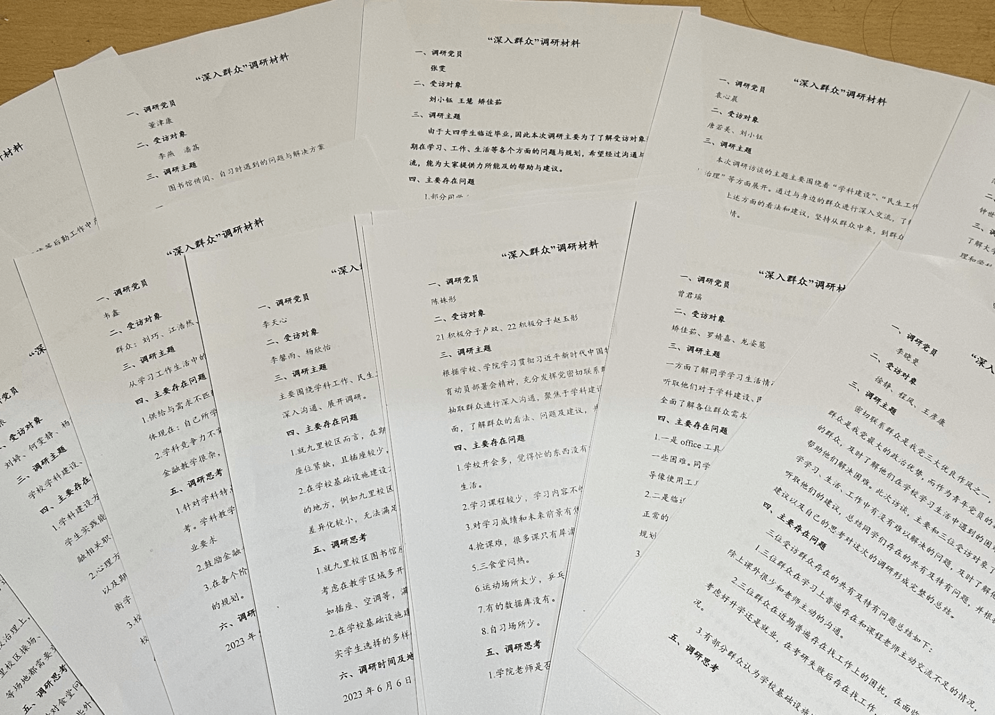 本科第二党支部组织全体党员同志从学科建设、民生工作、学校治理等方面和身边的同学深入沟通,调研访谈,将同学们的意见建议凝练总结后形成调研报告,积极寻求改进的方式方法,充分发挥党密切联系群众的优势,坚持从群众中来、到群众中去,听民声、察民情,努力为群众做好事、办好事。