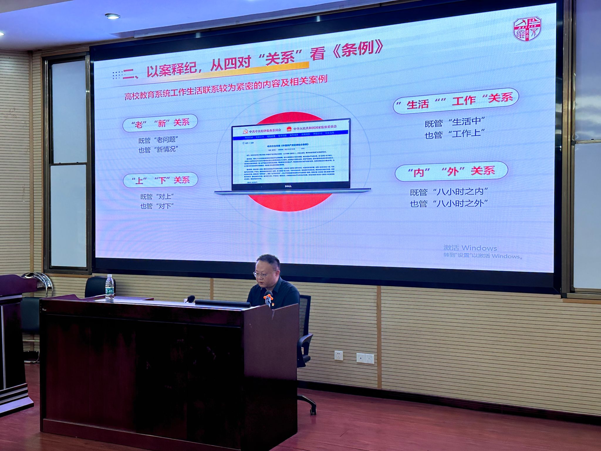 郭强以“心怀纪律‘戒尺’ 勇担育人使命”为主题,首先介绍了百年来党的纪律建设历程,强调了认真学习贯彻习近平总书记关于党的纪律建设的重要论述以及充分认识《条例》修订的重大意义,随后以案释纪,从四对“关系”、通过九个案例详细分析阐释了新旧《条例》的变化。最后,郭强告诫师生应身负立德树人神圣使命,模范做到心中有党纪,心中有把“尺”,用好“戒尺”下功夫,遵守《条例》作模范。