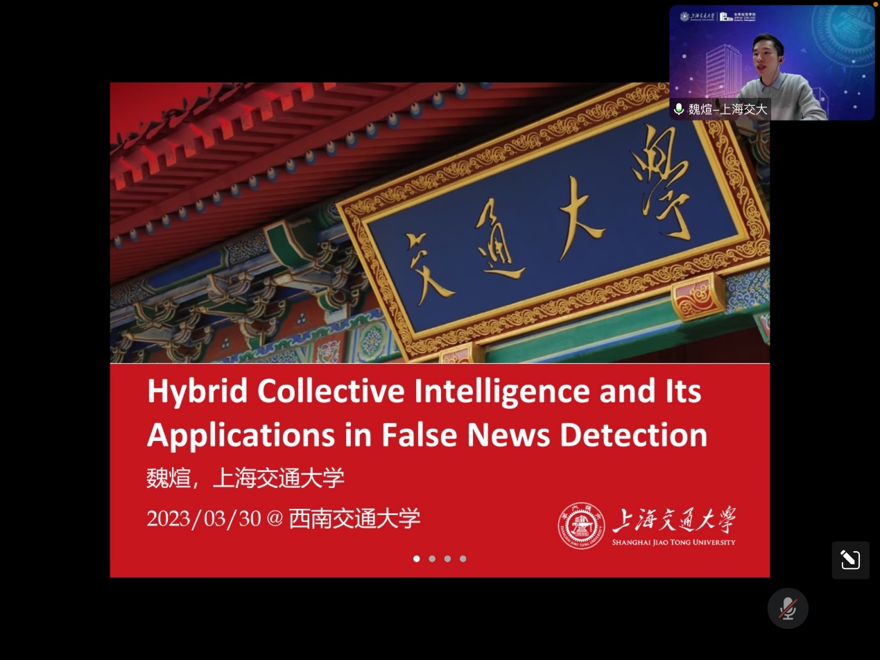 本次报告魏煊助理教授主要介绍了一项将混合集体智慧应用于虚假新闻检测中的研究。他首先对混合集体智慧和虚假新闻的概念进行了界定,再从研究动机、研究难点和创新点,建模、实验以及研究贡献和意义这五个方面对该研究进行了详细阐述。指出了群体智慧和机器智能存在的人机互补优势,并基于此通过贝叶斯建模,实现有效检测虚假信息的目标。