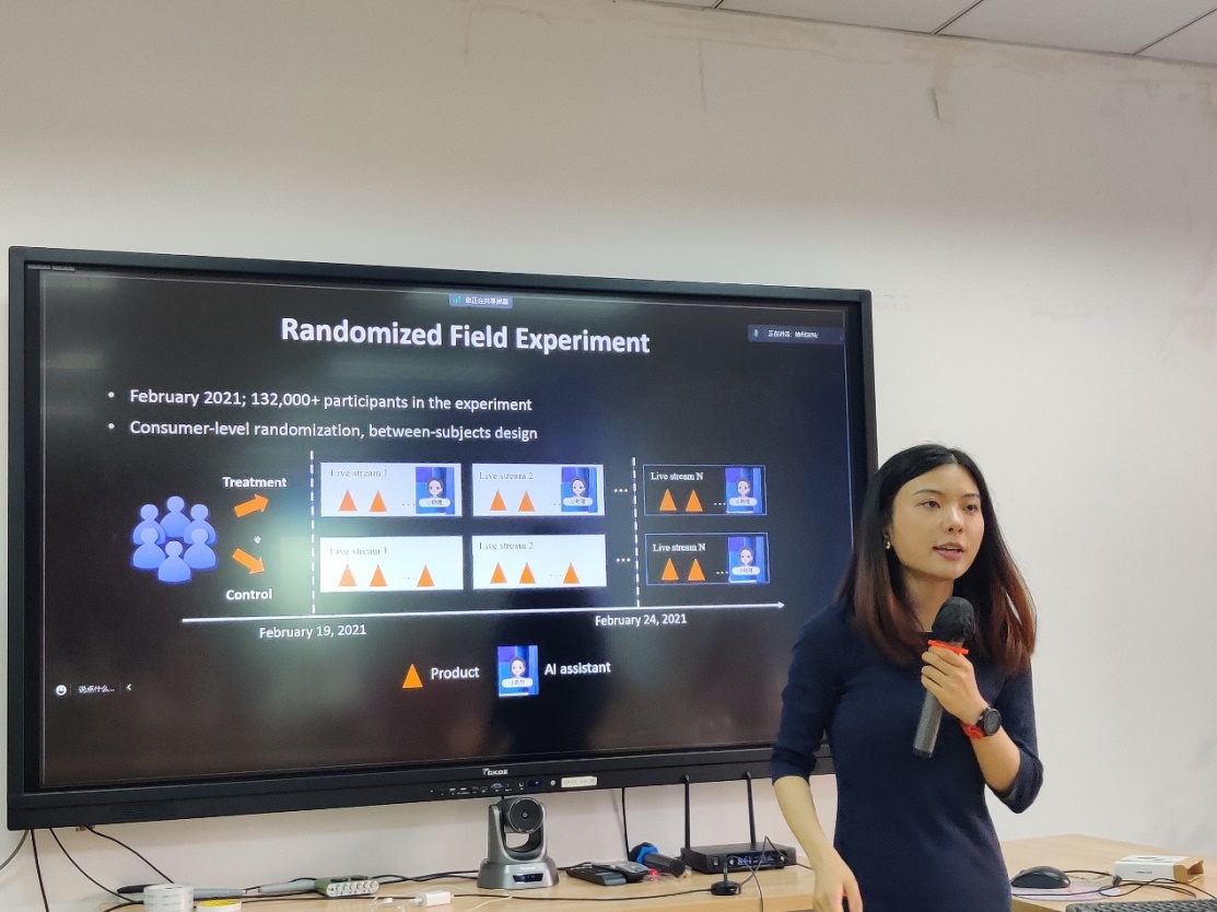 何玉梅助理教授首先介绍了国内外直播购物情况,并结合实际情况中主播无法满足每一位消费者实时咨询服务需求的缺陷,探讨了直播销售平台通过人工智能助手(AI助手)来缓解该问题的可能性和方法。接着从AI助手如何影响产品销售和AI助手是否影响产品退货这两个问题入手,详细介绍了该研究所提出的多阶段购买决策模型,并对相应的大规模田野实验及其结果做出了解释和说明。结果显示引入AI助手后,可在一定程度上提升销售额,显著降低退货率。