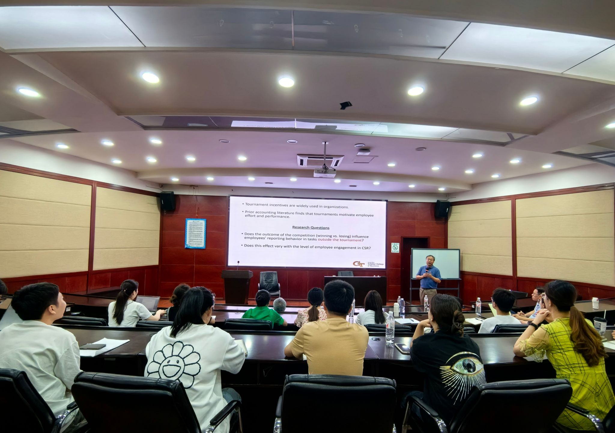 在讲座中,况熙教授介绍了最近的工作论文,采用实验研究方法探讨积极参与企业社会责任的员工在锦标赛激励环境中失败后,是否会更倾向于在管理报告中虚报绩效,以及这种倾向是否由于锦标赛失败后对自尊的影响。研究发现,更积极参与企业社会责任的员工会得到“道德许可证”,以致于当这些员工在锦标赛激励环境中失败时,更可能通过虚报业绩来找回自尊。