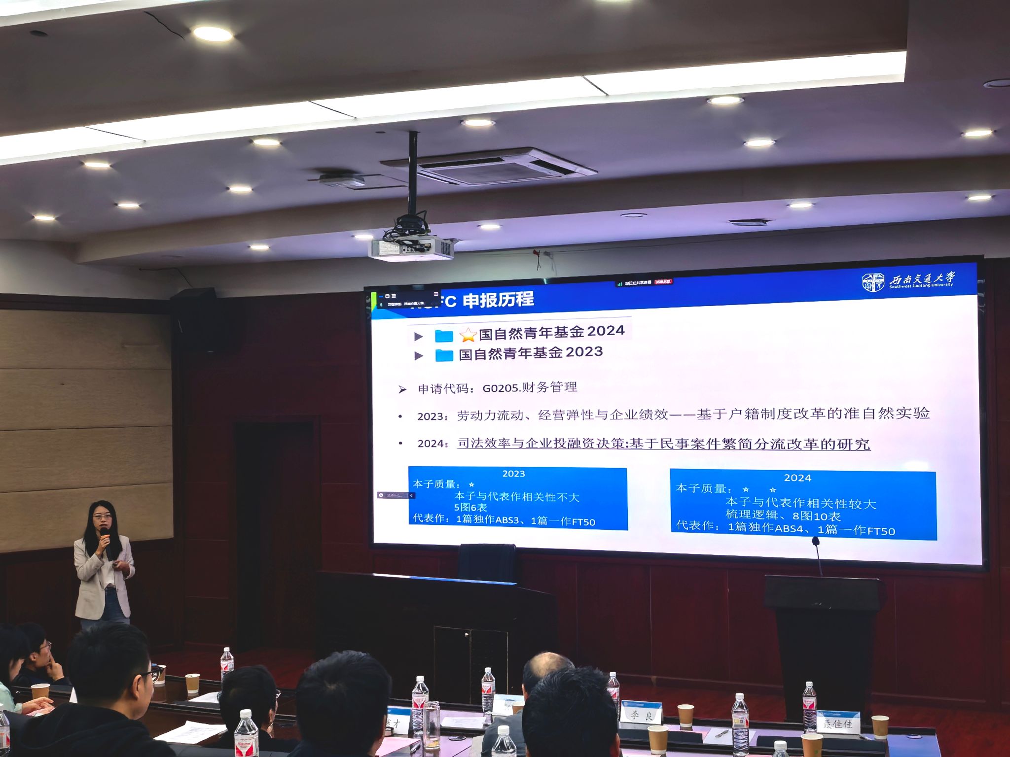 会计学系助理教授刘雨柔首先分享了她申报自科青年基金的经验。她从申报历程、选题新颖性、摘要撰写、研究内容框架图、注意事项等方面进行了详细讲解。刘老师强调,在撰写申报书时,要注意措辞的准确性和逻辑性,同时还要注意字体等细节问题。