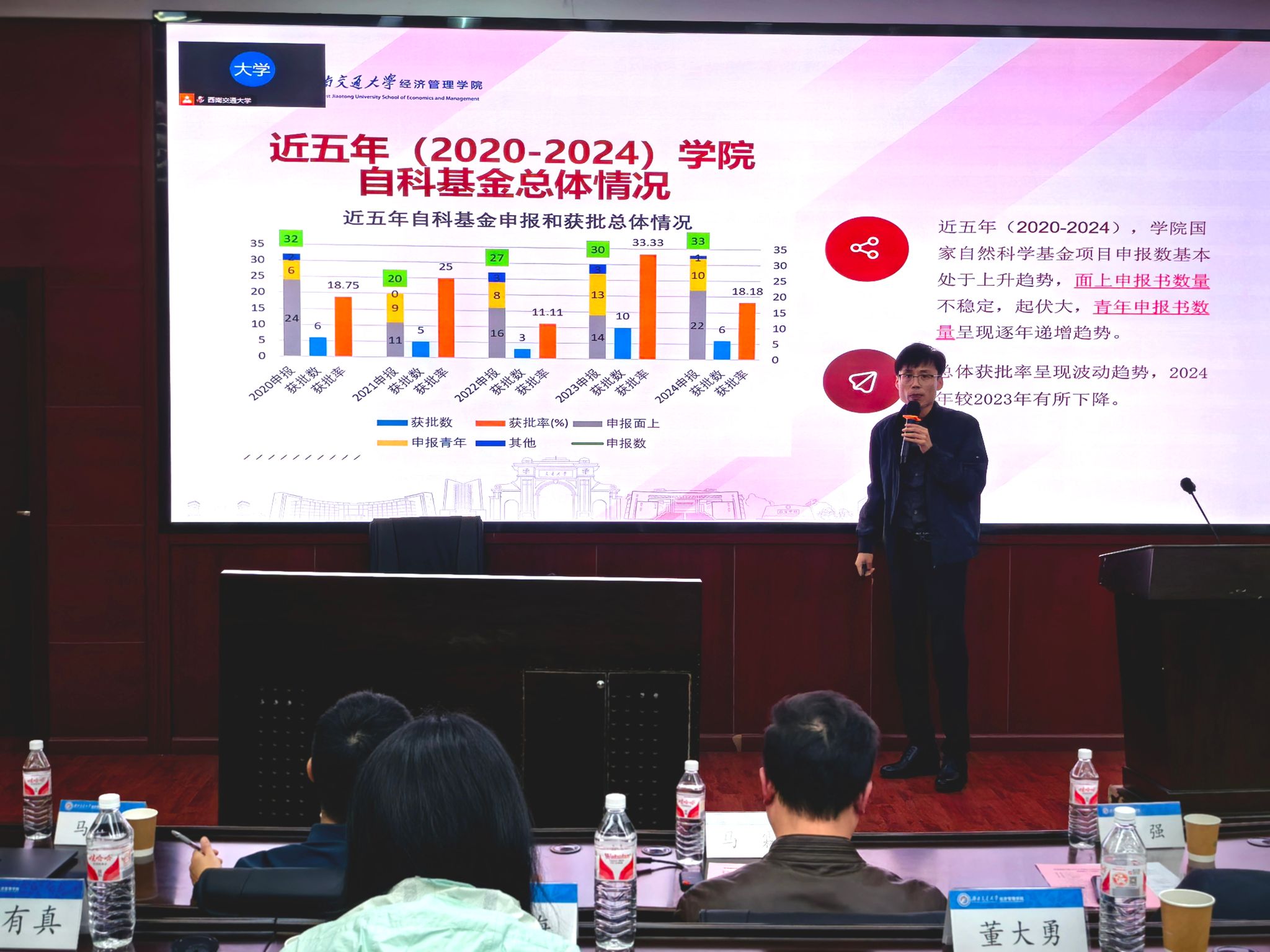 基金申报的现状,包括近五年的申报成功率和获批项目类型等关键数据。针对2025年度国家自科基金项目申报,马锋副院长提出了具体的工作计划,强调选题论证的重要性,并鼓励老师们尽早确定研究方向,围绕国家重大战略需求和学科前沿热点进行深入研究。他希望大家能在一月底前完成初稿撰写,留出足够时间进行反复修改和完善。