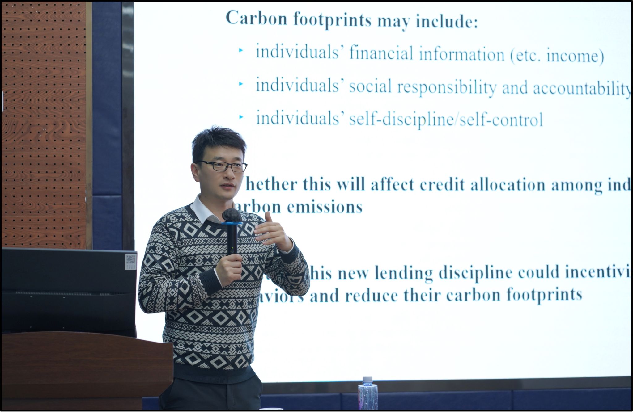 首先,部教授介绍了项目的初衷,并深入探讨了如何通过金融调控手段,从个人层面推动碳减排活动。他指出,在碳排放的实际情境中,个人是最大的“碳贡献者”,在整个碳排放过程中占据了相当大的比重。部教授还通过展示网上银行碳排放页面及碳排放计算器网站,向我们展示了碳排放信息在日常生活中的披露形式。