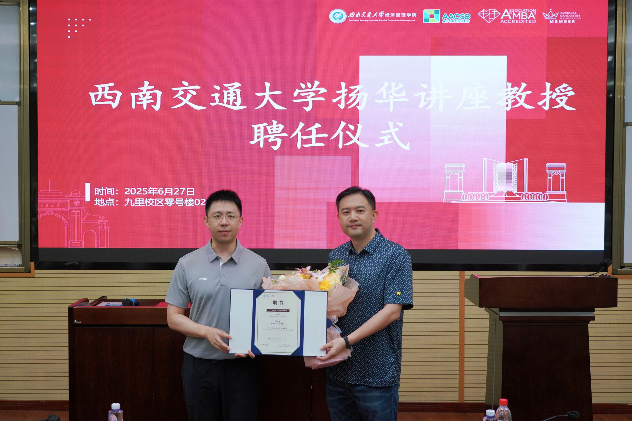 院长韩科教授首先介绍了姜宇威教授的学术背景与成就,并对姜教授加入我校表示热烈欢迎。随后,韩科院长为姜宇威教授颁发了西南交通大学扬华讲座教授聘书。