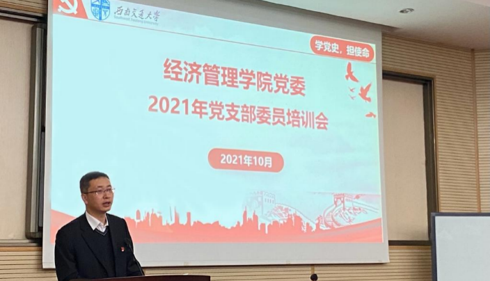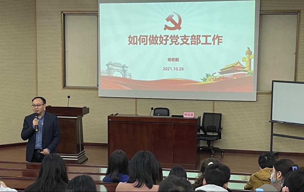 党委副书记杨宏毅从四个方面向各党支部委员们系统讲解了如何做好党支部工作。他首先详细解读了党支部的设置,支委会的选举、任期、流程以及各个党支部委员职责等内容。他强调,党支部书记要高度重视自己的带头作用,要带领本支部党员扎实开展好各项工作和活动。接着,他对党支部“三会一课”制度进行了强调,对党支部开展的各种活动类别进行了详细的介绍,加深了党支部委员们特别是2021级新生党支部委员们对党建工作的理解和认识。在第三部分,杨宏毅按照《中国共产党发展党员工作细则(试行)》系统介绍了发展党员的流程及注意事项,并要求党支部委员要进一步明确自己的工作职责,树立好工作信心,认真学习党支部各项工作条例及工作要求,严格把好发展党员的标准和流程,注意党员发展的各个时间节点,按要求及时做好归档等工作。最后,杨宏毅举例说明了党支部工作和发展党员过程中常见的各种问题,并现场对各种党建工作疑题进行了解答。