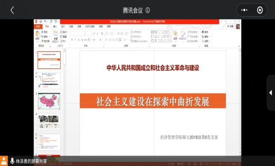 硕士2018级第六党支部专题组织生活会在腾讯会议上召开。此次会议由党支部书记林泽勇同志主讲,硕士2018级第六党支部全体党员参加。会议主题围绕“社会主义建设在探索中曲折发展”进行了学习和探讨。