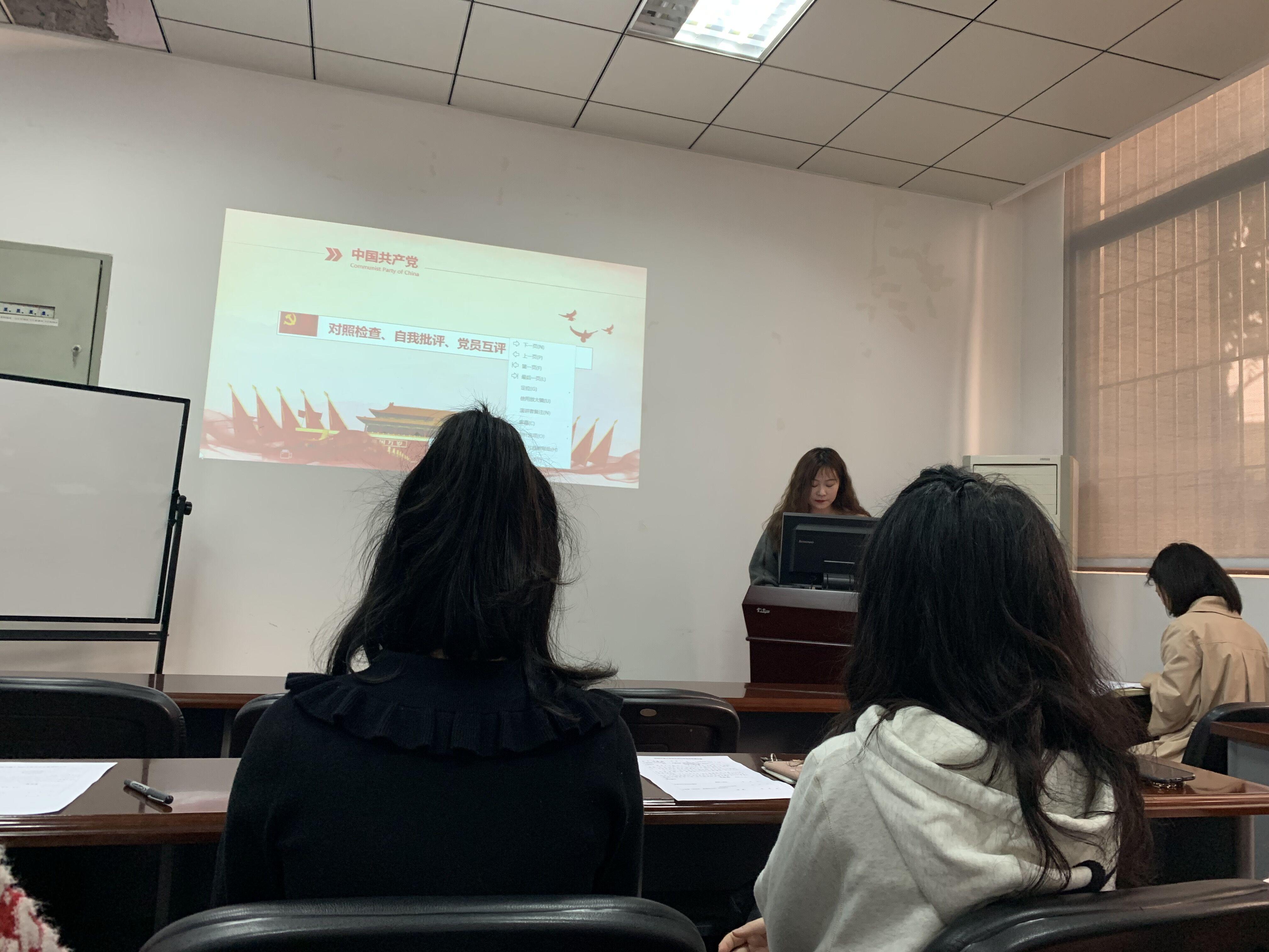 第二个环节是自我批评。刘璐同志作为班长首先从思想、学习和工作三个方面进行了对过去一年的总结和批评。刘璐同志指出:思想上,政治理论学习深度不够,学习的自觉性方面还存在较大的差距;学习上,不能举一反三,知识不能融会贯通;工作上,开拓进取精神不足,缺乏迎难而上的干劲和勇气。马艳林同志从工作、思想、学习和生活四个方面进行自我批评,其指出:在工作方面,作为本支部的宣传委员,每次新闻稿都会拖到截止日期的前一两天递交,没有做到积极主动的完成本职工作;在思想方面,仅仅满足于组织安排的学习任务,政治理论自觉学习方面还有所欠缺;在学习方面,经常三天打鱼两天晒网,没有做到持之以恒,时刻都不能松懈;在生活方面,生活作息紊乱,经常熬夜;希望在新的一学期里,自己能养成良好的生活和学习习惯,也希望大家在新的一学期能有一个新的面貌,新的态度。