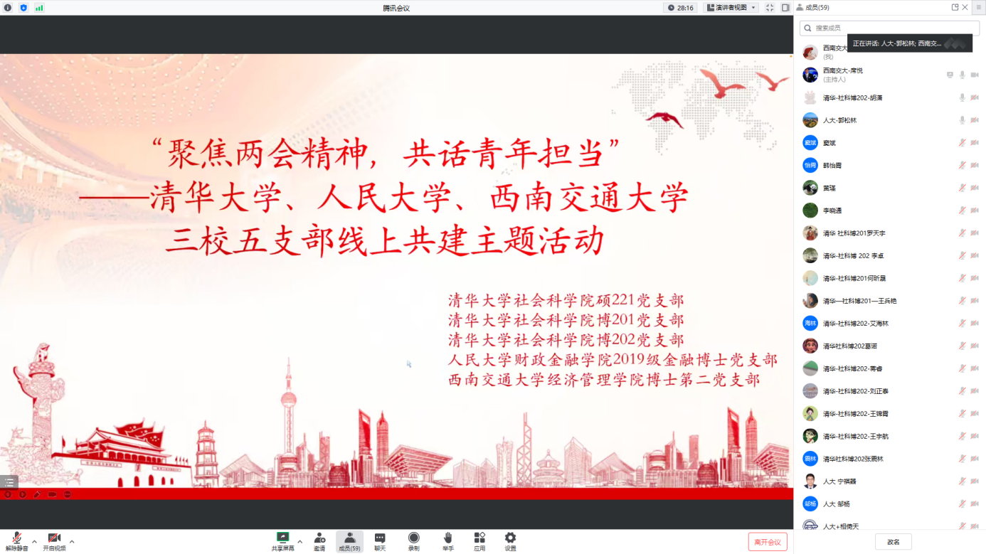 博士第二党支部书记席悦同志主持,西南交通大学、清华大学和人民大学的五个党支部近百余名党员同志参加了此次活动。