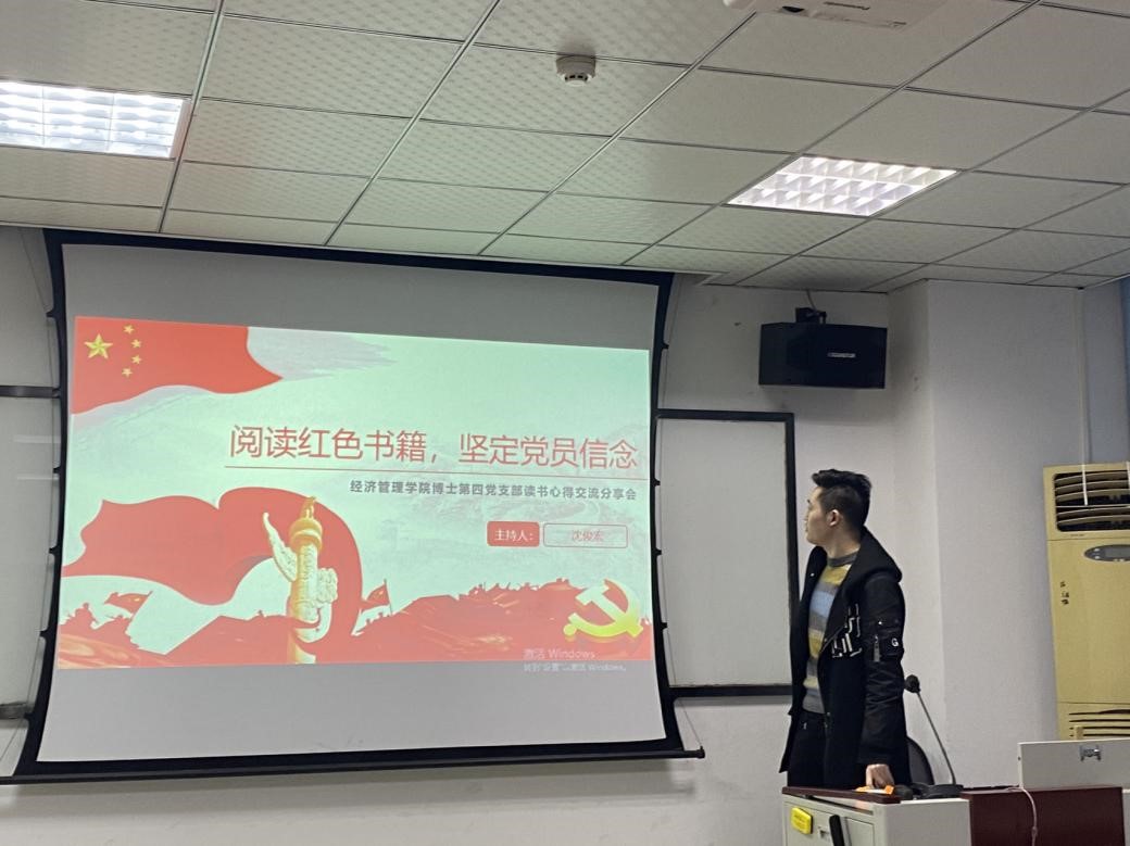 博士研究生第四党支部于2023年4月24日晚7点在九里校区信息楼0304教室开展题为“阅读红色书籍,坚定党员信念”读书心得交流分享会。首先,党支部书记沈俊宏同志介绍了本次读书心得交流分享会活动,说明了开展此次活动的背景、目的以及安排。