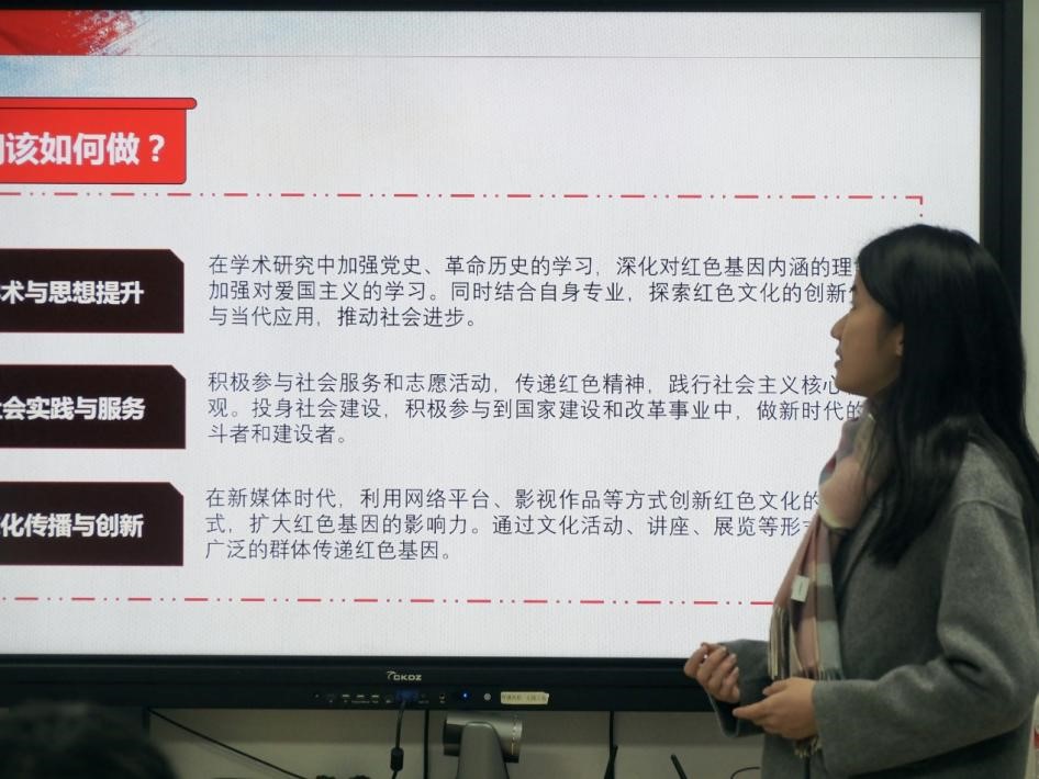 王睿同学主持,大家一起着重学习了红色基因的内涵与价值。红色基因,根植于中国共产党领导的革命、建设与改革的伟大历程,从党的诞生、长征的壮丽史诗、抗日战争的烽火连天到解放战争的胜利凯歌,直至新中国成立后的持续奋斗,始终为民族复兴注入不竭动力。在新时代的浪潮中,红色基因与现代社会的需求紧密结合,成为构筑民族复兴文化基石、引领社会主义事业破浪前行的重要力量。