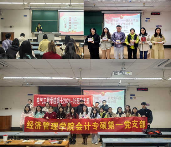 电气硕士第五党支部在九里校区4407b教室联合举办了马克思主义理论读书分享会。会计专硕第一党支部陈心怡、何诗漫、刘畅畅同志与电气硕士第五党支部范银兵、保丹宇、刘燕同志分别分享了《实践论》《资本论》等马克思主义经典著作的相关内容,从理论的角度深入剖析了马克思主义的基本原理和核心观点,探讨了马克思主义在现实生活中的应用和价值。在自由讨论环节,两个党支部党员积极发言,就学习中的困惑和心得进行了深入交流。大家一致认为,通过本次读书分享会,进一步加深了对马克思主义理论的理解,增强了党性修养和责任感。此次活动为两个支部的党员们提供了一个展示学习成果和交流思想心得的良好平台,也进一步加强了支部的凝聚力和向心力。