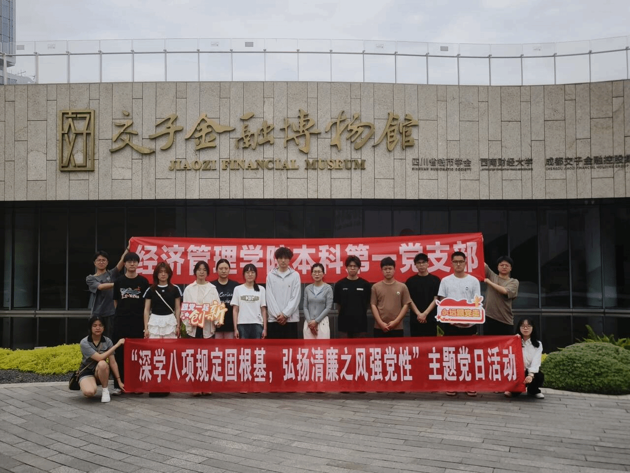 本科第一党支部赴成都交子金融博物馆开展“深学八项规定固根基,弘扬清廉之风强党性”主题党日活动,将交子红色货币金融文化与党员廉洁教育、作风建设深度融合,为支部青年党员打造了一堂“行走的思政课”。