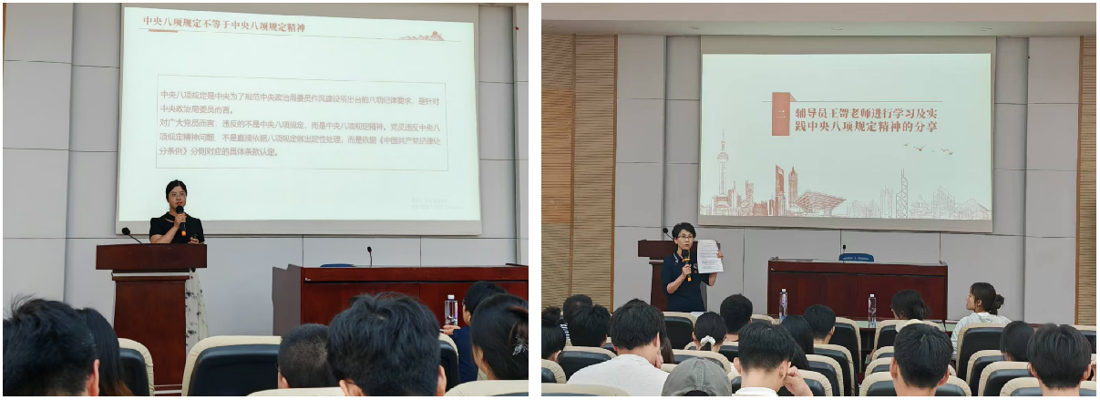 辅导员王哿老师采用理论与案例相结合的方式帮助同学们进一步了解中央八项规定精神。随后,三位支部书记围绕深入贯彻中央八项规定精神学习教育为大家讲党课,进一步巩固了党员同志们对中央八项规定精神的理解。
