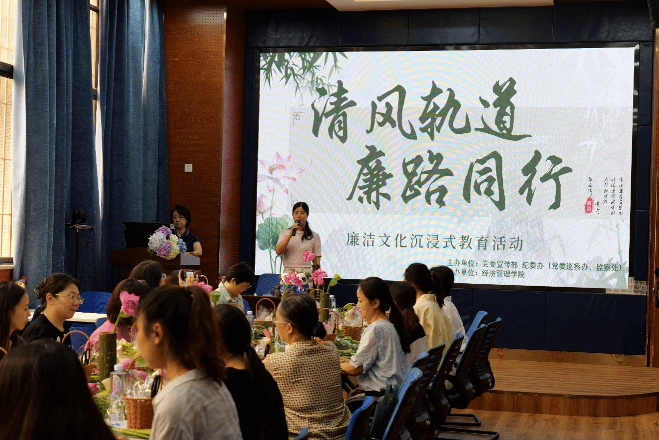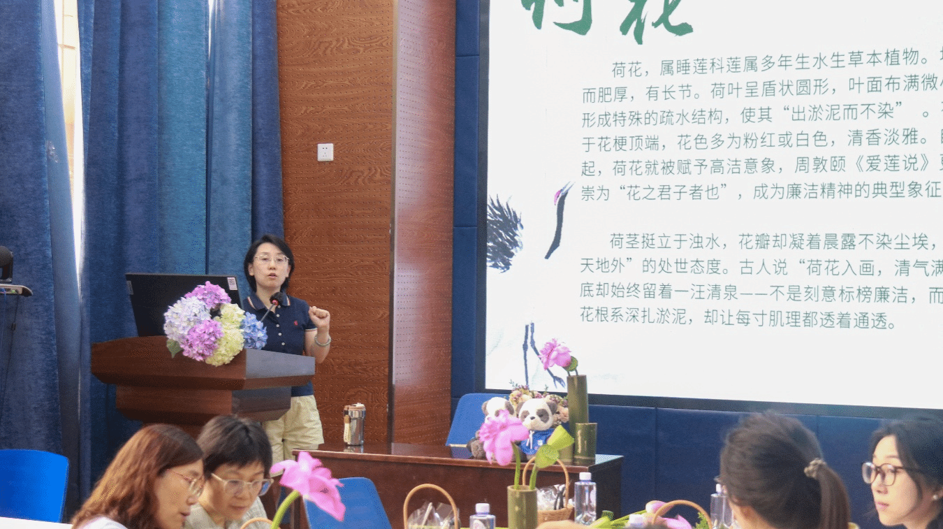在“知‘花’明廉”环节中,宗桦教授以花为媒解构“廉”文化,借插花意象将清廉品格具象化:荷以“出淤泥不染”喻党员干部守身如玉、底线如磐的政治风骨;莲凭“中通外直”状表里澄澈、磊落如砥的为官气象。