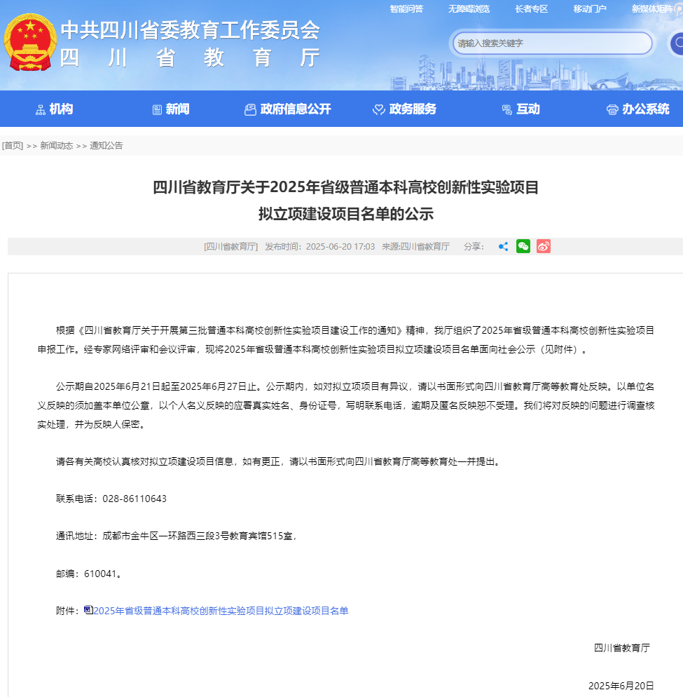 【综合】易游体育 获批2025年省级普通本科高校创新性实验项目拟立项建设项...