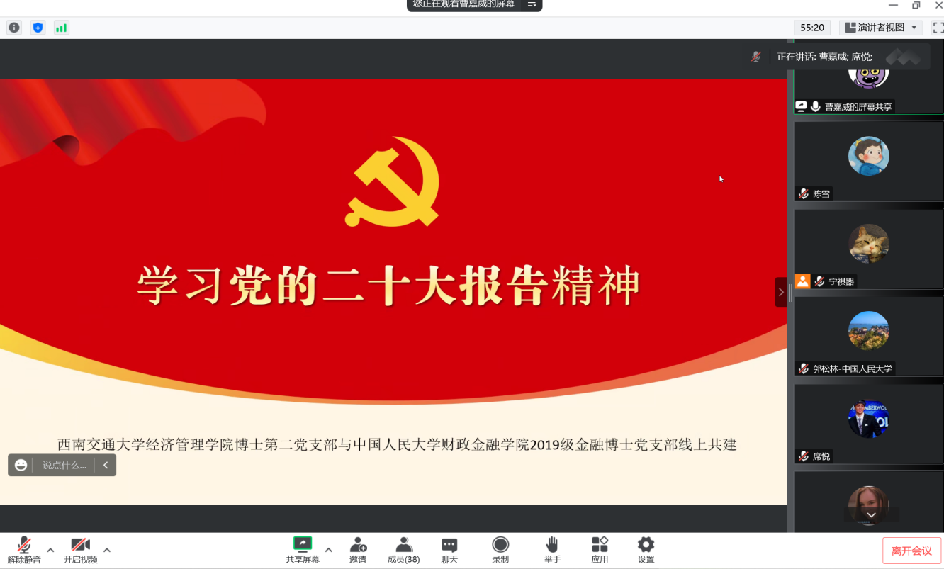 2022年11月9日晚上20:00,易游体育官方网站 博士第二党支部和中国人民大学财政金融易游体育 2019级金融博士党支部共四十多名学生党员举行线上党支部共建主题党日活动,深入学习和领悟党的二十大精神。活动由易游体育官方网站 博士第二党支部的席悦同志和中国人民大学财政金融易游体育 2019级金融博士党支部的郭松林同志...