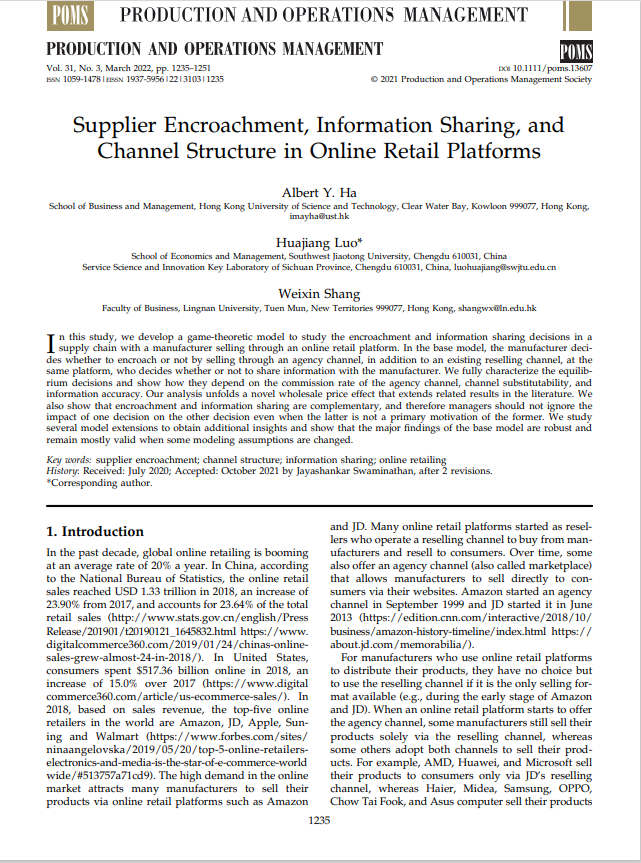 易游体育-易游体育官方网站-YY SPORTS 罗华江老师于2022年3月在UTD 24期刊Production and Operations Management在线公开发表题为Supplier Encroachment, Information Sharing, and Channel Structure in Online Retail Platforms的论文。该论文考虑由一个制造商和一个网络零售平台组成的供应链中,制造商的渠...